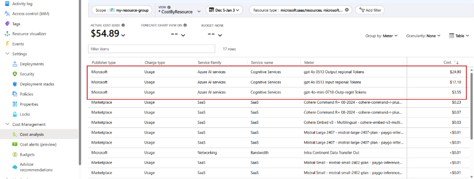 图:Azure 成本分析中 Azure AI Foundry 模型成本消费概览