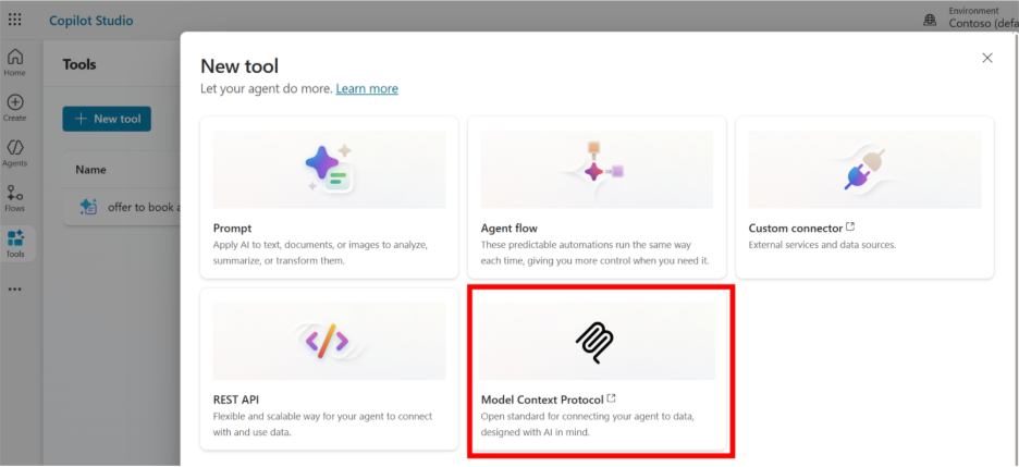 最近,模型上下文协议(MCP)连接器也作为新工具直接在 Copilot Studio 中可用。