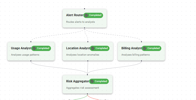 Alert Router 是工作流入口。当新告警到达时(例如:来自多个国家的登录尝试、交易突然激增),它会启动工作流并把任务并行分发给多个代理。它负责的是“编排”,而不是“解释数据”。