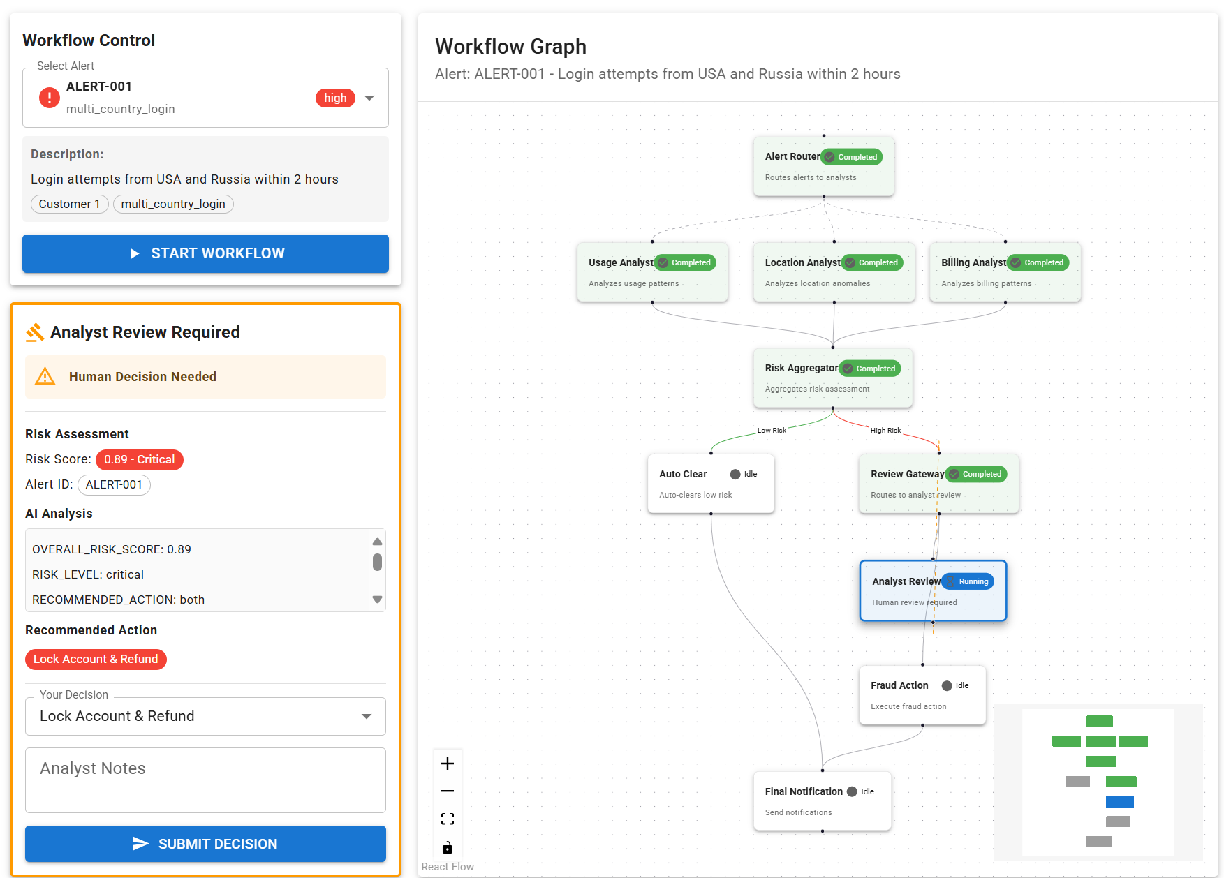 当案例高风险时,系统会 checkpoint 并暂停,等待人工审核。分析师批准或拒绝后,工作流从 checkpoint 继续执行直至完成。这样每条决策路径都能被复现并被记录,使系统既“智能”也“可审计”。