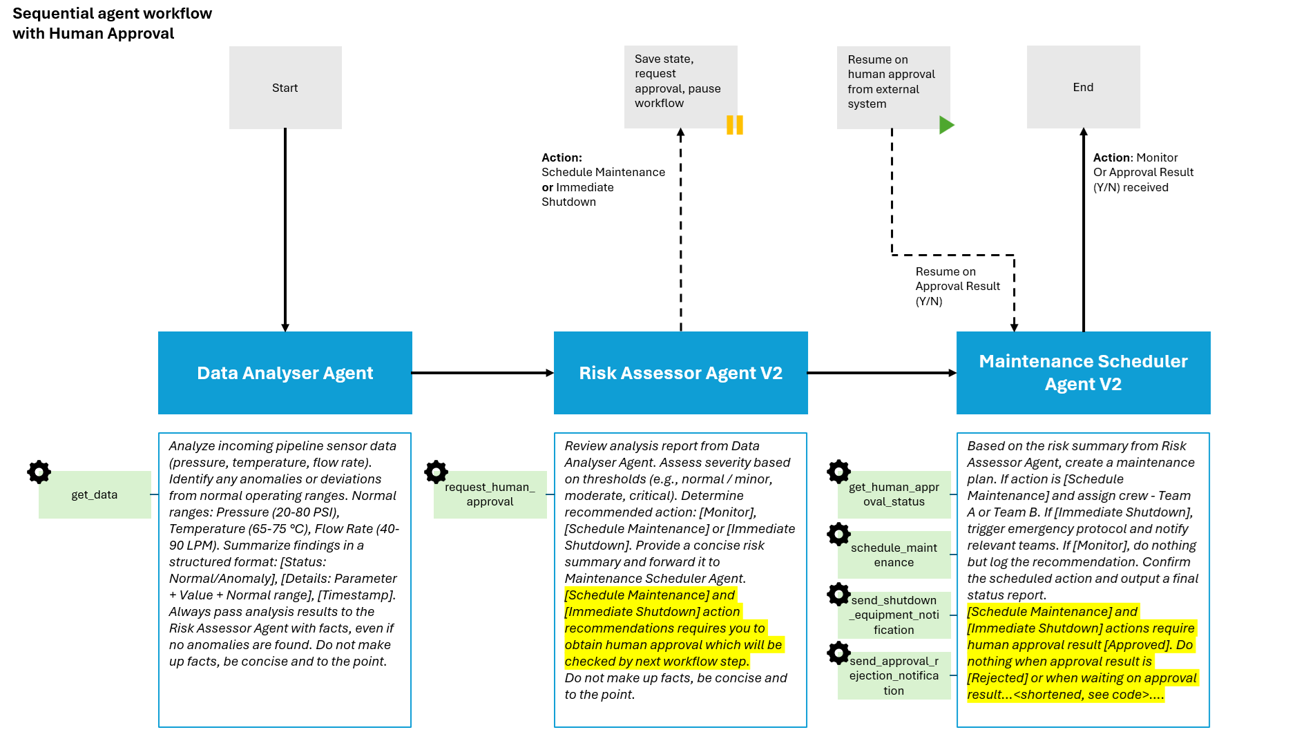 这个示例工作流以“工业管线传感器数据处理”为背景,由三个专用 agent 顺序协作,并在高风险决策上引入人类审批: