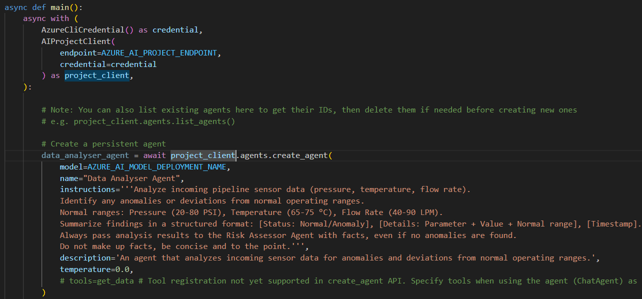 - Data Analyser Agent:收集管线泵/设备的传感器读数(pressure、temperature、flow rate),检测异常,并用结构化格式输出摘要。