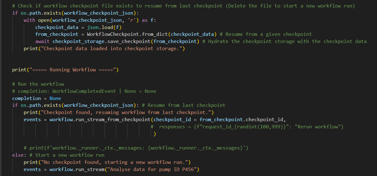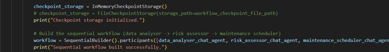 脚本会初始化一个内存中的 checkpoint storage,然后构建一个顺序工作流。Agent Framework 的 Checkpoints 能在工作流执行到特定点时保存状态,并允许稍后从该点继续运行,适用于长运行/可中断流程。