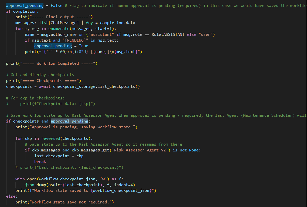 流程里最关键的机制是:一旦出现高影响决策,工作流会在检查点暂停,保存状态,并请求人类审批;待外部系统记录审批结果后,工作流从上次检查点恢复,验证审批状态,然后再执行“安排维护/停机”等关键动作。示例中外部系统用一个 JSON 文件模拟(也可以替换为真实系统的 API/数据库)。