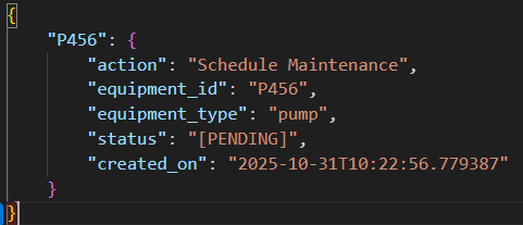 示例用 approval_db.json 来模拟外部审批系统(在真实生产环境中可以替换成 API 调用或数据库)。当需要审批时,脚本会生成该文件并写入状态 [PENDING]。只有当人工把状态改成 [APPROVED],Maintenance Scheduler Agent (v2) 才会在工作流重跑/恢复时真正执行动作;如果是 [PENDING] / [APPROVED] / [REJECTED],工作流都会从合适的步骤恢复,而不是从头再来。