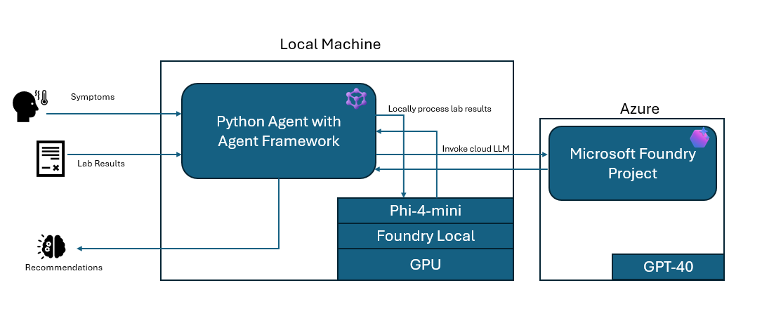 原文讨论的核心模式是:用 Agent Framework 构建一个“本地运行的智能体(agent)”,让它在需要强推理/规划时调用 Azure AI Foundry 里的云端模型(示例为 GPT-4o),但在处理原始敏感文本(例如医疗检验报告、法律文书、财务报表等)时改为调用 Foundry Local 在本机 GPU 上运行的小模型(示例为 phi-4-mini)。这样可以在不上传原始敏感数据的前提下,利用云端模型完成更高质量的推理与输出。