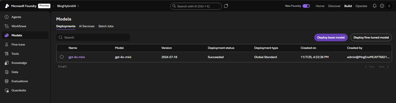 云端侧的关键是创建一个 Microsoft AI Foundry project,以便以托管方式调用云端模型(例如 GPT-4o-mini),并避免额外的部署/服务器配置。Agent Framework 只要指向该 project,完成认证,就可以直接调用云端模型。