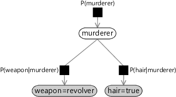 我们希望在这个新模型中,在给定 weapon 与 hair 的取值后,计算 murderer 的后验分布。由于我们已经在前一个模型中(只引入了 weapon)得到过 P(\text{murderer}\mid\text{weapon}),我们希望把它复用,而不是从头开始。